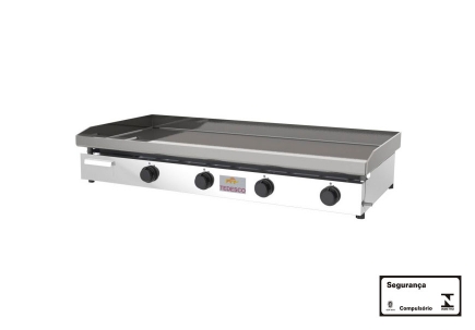 Chapa de aço carbono SAE 1020 com 6mm de espessura inteiriça, desta forma o calor é retido por mais tempo, proporcionando economia de energia e alcançando a temperatura necessária para o bom selamento da carne;